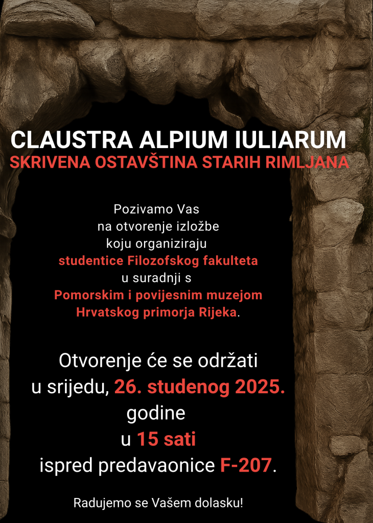 Katedra za umjetnost starog i srednjeg vijeka Odsjeka za povijest umjetnosti srdačno vas poziva na otvorenje izložbe Claustra Alpium Iuliarum: skrivena ostavština starih Rimljana.