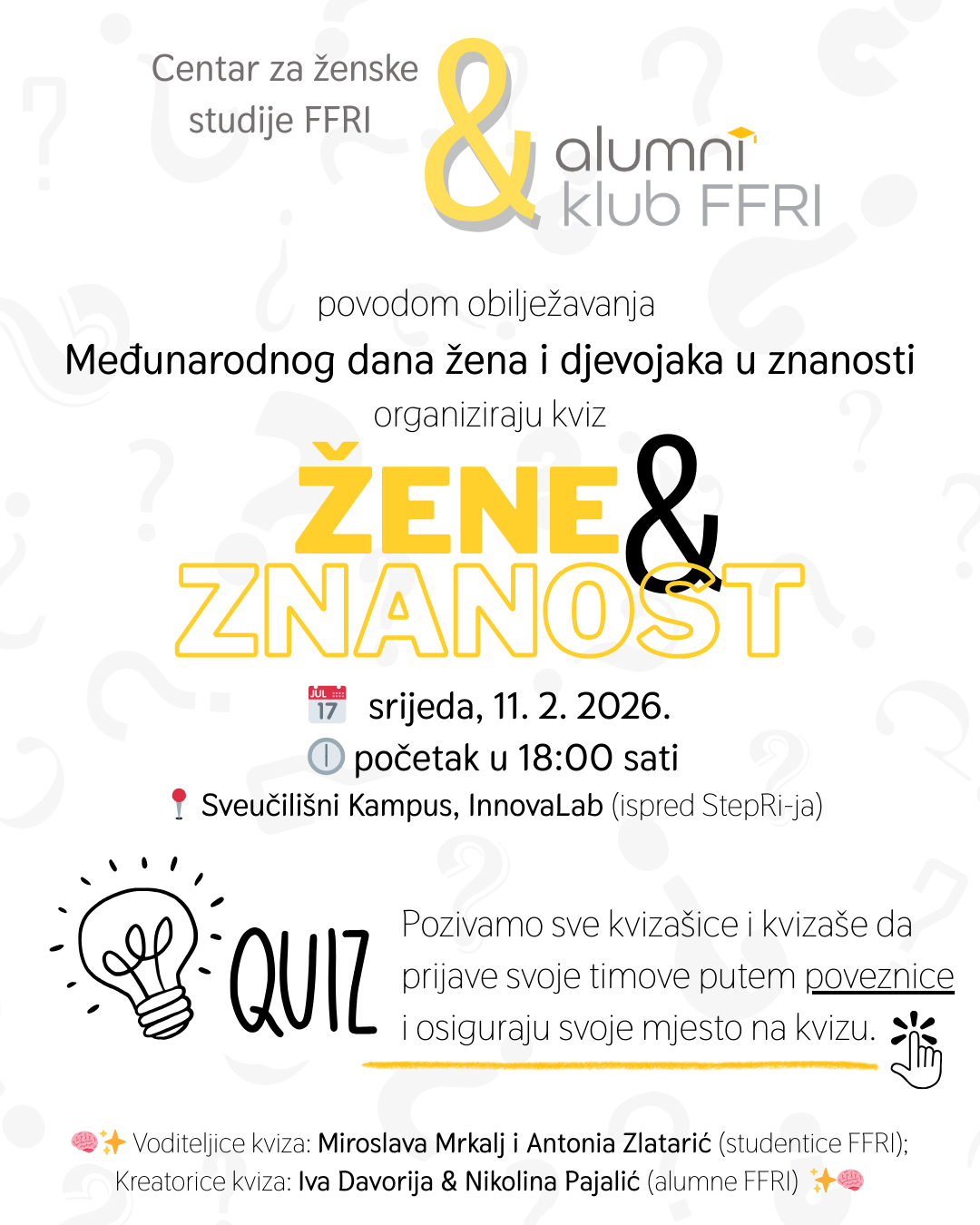 povodom obilježavanja Međunarodnog dana žena i djevojaka u znanosti, Centar za ženske studije i Alumni klub Filozofskog fakulteta u Rijeci pozivaju vas na kviz Žene & znanost koji će se održati u srijedu 11. veljače 2026. godine s početkom u 18:00 sati u prostoru InnovaLaba na Sveučilišnom kampusu (ispred StepRi-ja).