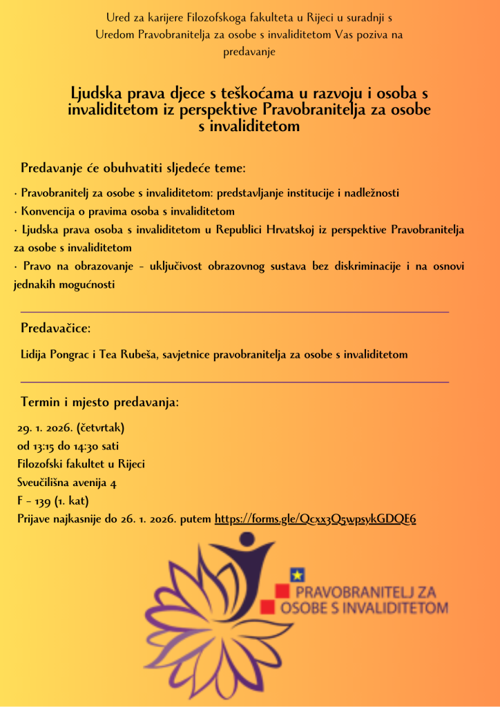 Ured za karijere Filozofskoga fakulteta u Rijeci u suradnji s Uredom Pravobranitelja za osobe s invaliditetom Vas poziva na predavanje Ljudska prava djece s teškoćama u razvoju i osoba s invaliditetom iz perspektive Pravobranitelja za osobe s invaliditetom.
