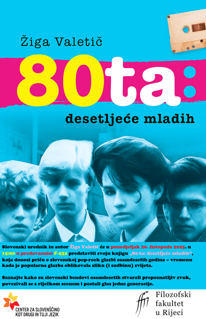 Slovenski urednik i autor Žiga Valetič će u ponedjeljak 20. listopada 2025. u 15:00 u predavaonici F-232 predstaviti svoju knjigu 80-ta: desetljeće mladih, koja donosi priču o slovenskoj pop-rock glazbi osamdesetih godina – vremenu kada je popularna glazba oblikovala sliku (i sudbinu) svijeta.