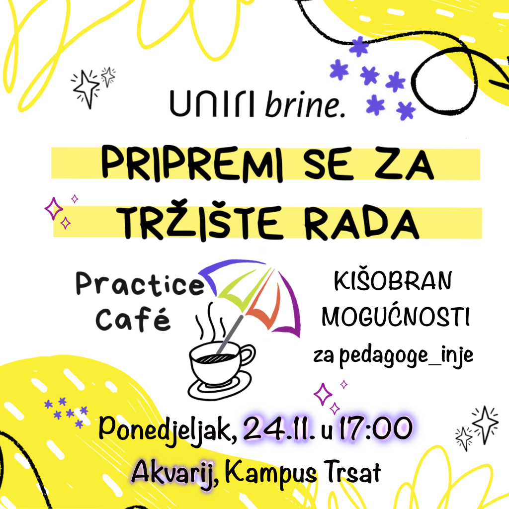 Drage studentice i studenti, pozivamo vas na „PRACTICE CAFÉ – Kišobran mogućnosti“ – tribinu namijenjenu upoznavanju sadašnjih studenata/tica s prvim radnim iskustvima svojih donedavnih kolega/ica, alumna pedagogije Filozofskog fakulteta u Rijeci! Na tribini će alumni u opuštenoj atmosferi predstaviti svoja dosadašnja radna iskustva, stečena znanja i vještine, ali i izazove s kojima su se susreli nakon stjecanja diplome i prilikom ulaska na tržište rada.