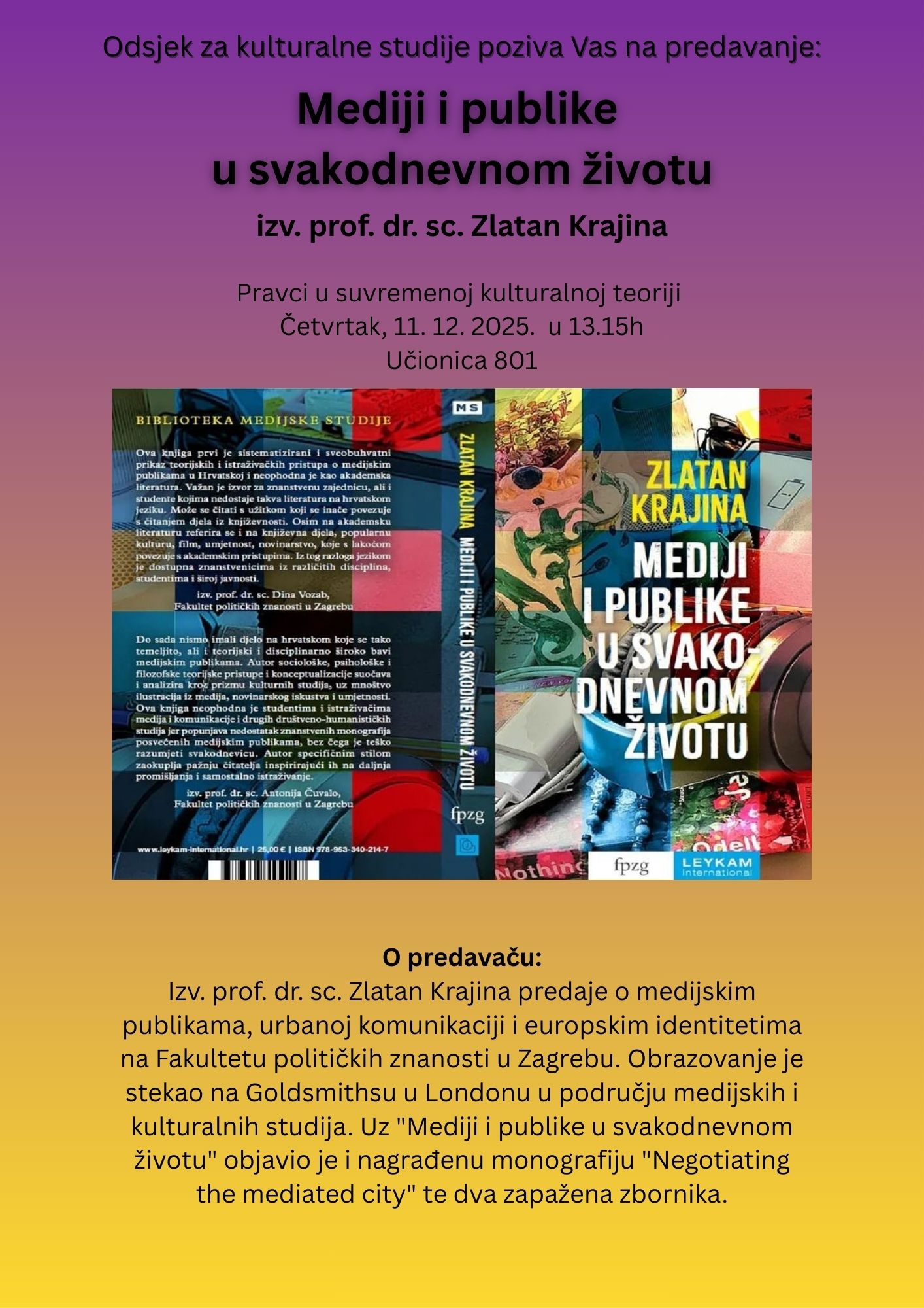 Odsjek za kulturalne studije poziva vas na gostujuće predavanje izv. prof. dr. sc. Zlatana Krajine: