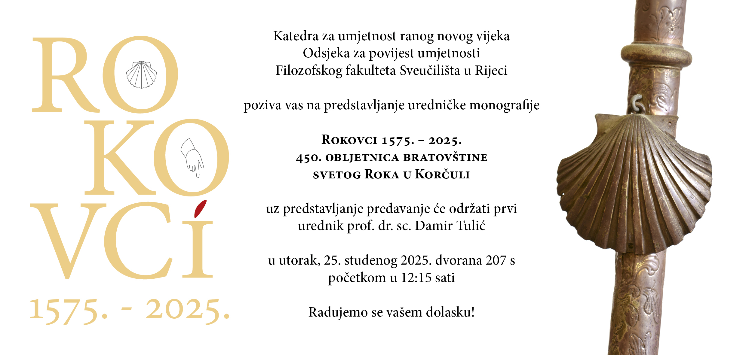 Katedra za umjetnost ranog novog vijeka Odsjeka za povijest umjetnosti poziva vas na predstavljanje uredničke monografije ROKOVCI 1575. – 2025. 450. OBLJETNICA BRATOVŠTINE SVETOG ROKA U KORČULI koje će se održati u utorak 25. studenog 2025. u dvorani 207 s početkom u 12:15 sati.